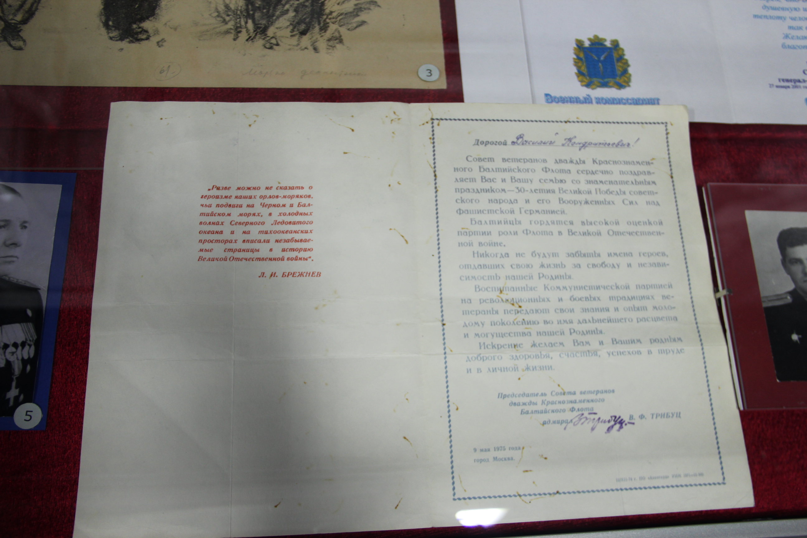 В годы Великой Отечественной войны морские пехотинцы доблестно сражались с немецко-фашистскими захватчиками, вызывая у них ужас и страх. Об этом свидетельствуют прозвища, которыми враг называл наших воинов – «чёрные дьяволы» и «чёрная смерть». На выставке – фотографии, почётные грамоты и документы Денисенко Василия Кондратьевича, офицера 4-й бригады морской пехоты, участника обороны Ленинграда и боёв за взятие Кёнигсберга.