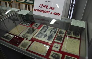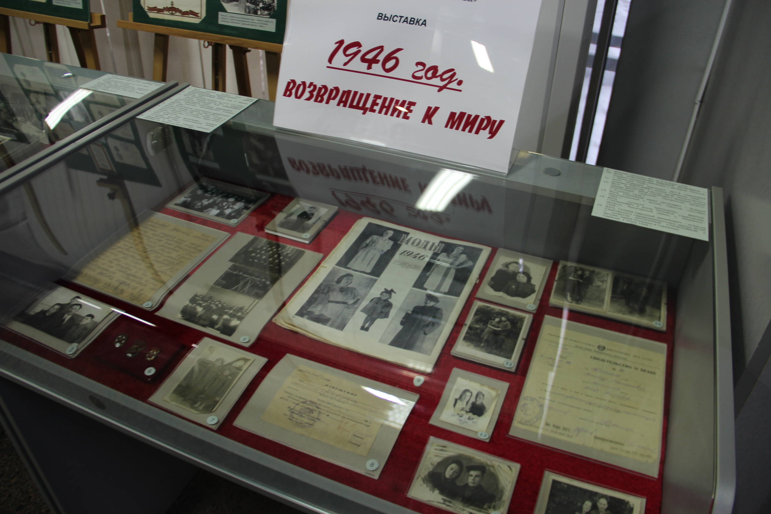 Журнал «Огонёк» №1 от 6 января 1946 года был посвящен выборам в Верховный Совет СССР, а также знакомил женщин с новыми модными тенденциями. Жизнь многих семей налаживалась, с фронта возвращались родные и близкие, создавались новые семьи. На выставке фотографии и свидетельство о браке Виктора Степановича и Анны Титовны Тихониных, выданное 7 апреля 1946 года. Особенно тяжело было пережить боль утраты тем, чьи родные погибли или пропали без вести. На извещении о том, что старший лейтенант Лямзин П.А. пропал без вести в 1942 году, можно увидеть 1946 год – год выдачи этого документа родным.