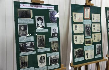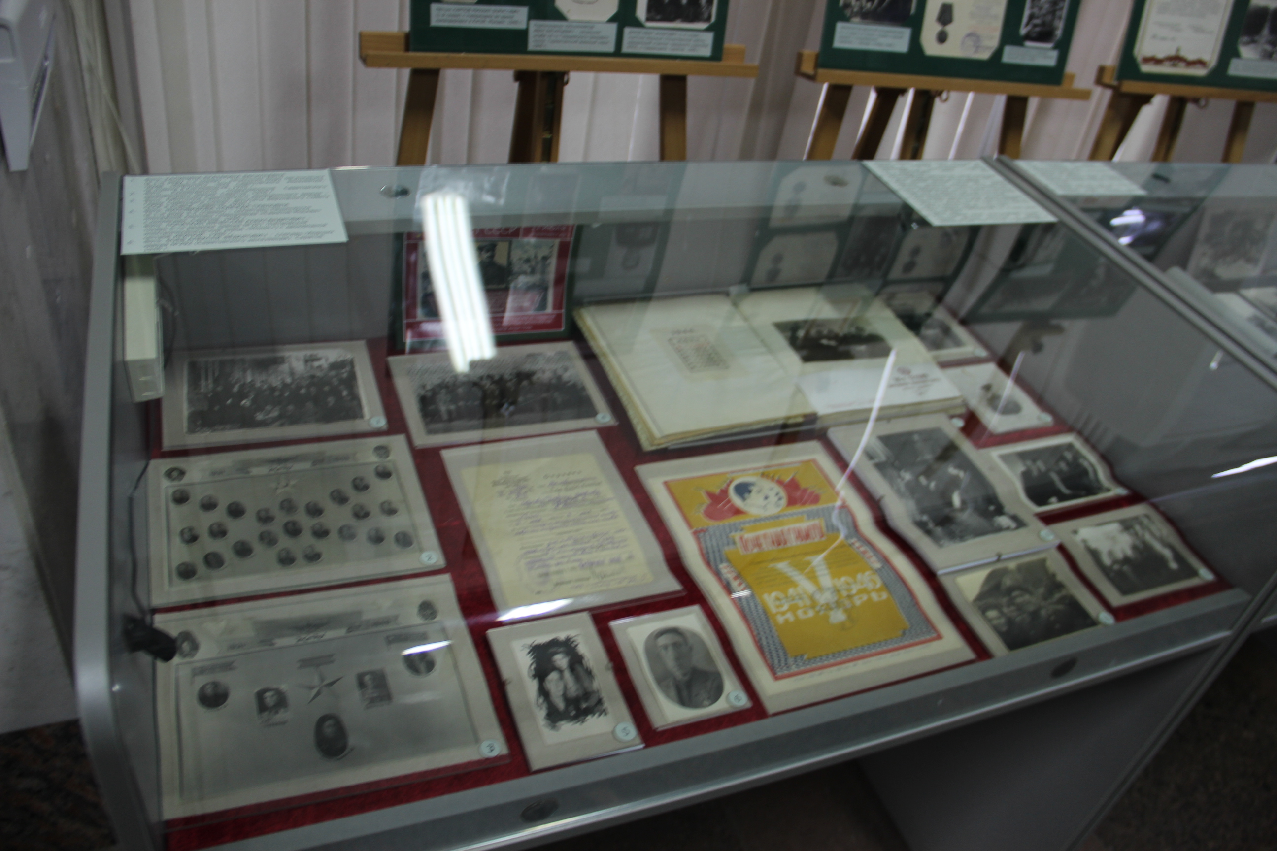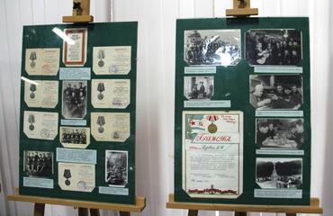 Отдельный раздел выставки посвящен нашим землякам – участникам Великой Отечественной войны. На многочисленных фотографиях изображены военнослужащие Красной армии, находящиеся в 1946 году на службе в Германии, Румынии, Польше, Китае и в СССР: Тихонов К.А., Бирюкова В.Н., Фаликов Ф.Г., Штокало В.А, Карпов М.Б., Мананников И.В. и другие. На обороте своей фотографии Галина Андреевна Мушта написала: «Такими мы возвращались с фронта».