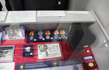 С самого начала специальной военной операции морские пехотинцы приняли в ней активное участие. Благодаря отличной подготовке, волевым качествам и навыкам они наносят противнику серьёзный урон. На выставке представлен берет морских пехотинцев, нарукавный шеврон, современные медали ВС РФ.